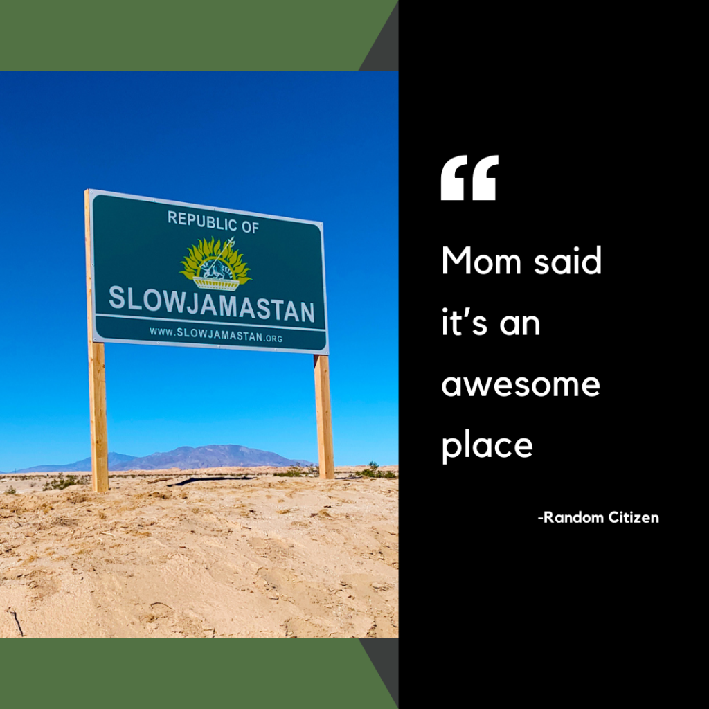 Slowjamastan sits in the heart of NorthAmerica, a cozy Micronation nestled within ImperialCounty, SouthernCalifornia. Our kingdom spans a whopping 11.07 acres, cozily cradled next to California State Route 78, sandwiched between the delightful American towns of Ocotillo Wells and Westmorland. It’s the perfect spot for a sovereign state that doesn’t take itself too seriously.